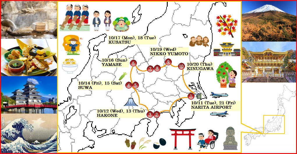 | A tour to enjoy the onsen and autumn color leaves. We will visit Kusatsu and Hakone, which are called the best onsen areas. Enjoy the onsen as well as the tasteful townscape. In addition, the sceneries of the autumn countryside, the autumn color leaves of Mt.Fuji and the delicious foods awaits you. For those that like onsen, leisurely sightseeing, and the autumn color leaves we recommend this tour. |