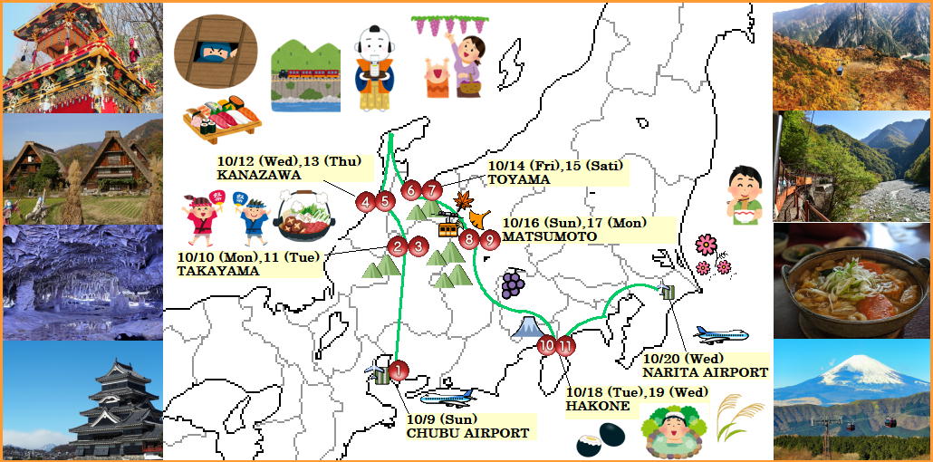 From the hotel go to Takayama Morning Market, a daily market near the river with stalls selling vegetables, fruits & other local farm products. Then go to Kamikochi which is part of the Northern Japan Alps, Japan’s famous mountain scenic spot, a remote mountainous highland valley. See Kappabashi and the autumn leaves color change is beautiful. Next visit Hida Great Limestone Cave, a large high-altitude limestone cave with unique rock formations of images. Then return to same hotel. | × |