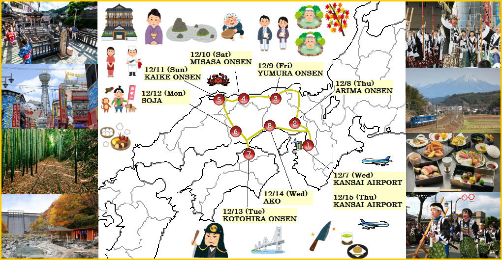 | In Japan there are about 3000 onsen resorts. Out of those just a few that Handmade Tours would like to recommend is this West Japan go around onsen tour. A tour not only to go into the onsen but to enjoy the onsen town. Check-in time is early as about 3 pm and you can enjoy these onsen towns. There is only 8 nights and is pretty short but will be staying at good quality inns. At this time of year is a delicious time for crab, oyster and fugu. And on Dec.14 is remembered as “Uchi-Iri" (Entering the House), refers to the attack by the 47 ronin at the mansion of Lord Kira. Let's see the Ako 47 ronin parade. To this day it is still relevant as it epitomizes the code of the samurai warriors, values that are considered important in modern Japan, one of loyalty and justice. For those that want sightseeing to be moderate, enjoy onsen, eat delicious food & to relax, this is a recommended tour. |