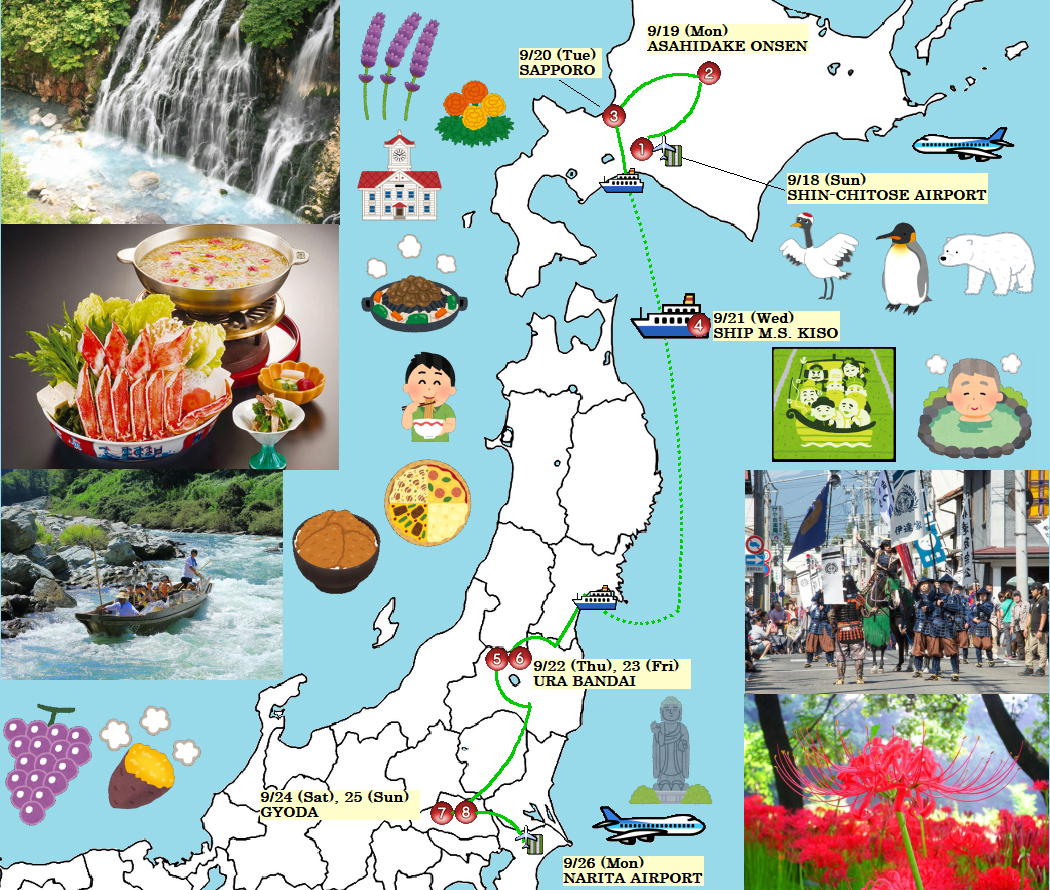 | This is a tour to enjoy September, the beginning of autumn. During this time you can enjoy the sightseeing spots, events (Hokkaido flowers, salmon run, Aizu Festival, rice field art, and Kinchakuda Manjushage Festival). You will love the beauty of early autumn. And for those that like samurai, and if your ancestors are from Fukushima pref. you must see the Aizu Festival. Feel the Aizu soul, Aizu (Fukushima) soul who lives in righteousness without seeking profit. Meals are Hokkaido specialties, crab cuisine, Genghis Khan and other local cuisines. Also enjoy autumn specials, sweet potatoes, grapes, etc. We also offer ship cruise although just for one night. |