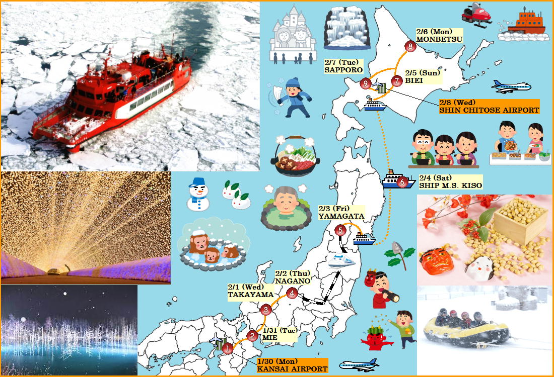 | Let's enjoy winter in Japan. There are fun unique to winter such as the Sapporo Snow Festival, Drift ice, Snow Monsters, Snow monkeys, and Shirakawa-go where snow is piled up. Also enjoy Sukiyaki, Ramen, and Crab cuisine that you eat in the cold winter are excellent. This tour from Osaka to Hokkaido covers famous winter tourist destinations in Japan. |