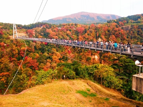 From the hotel we head to Mt. Aso, which has one of the largest calderas in the world. On the way, we visit to the Kokonoe Yume Otsurihashi, is the highest suspension bridge which is only for walkway in Japan. Enjoy the scenery of the autumn leaves. Then we go to Daikanbo view spot, it offers the best 360-degree panoramic view in Aso. Here you can see the Five Peaks of Aso, as well as the Kuju Mountain Range. The Five Peaks of Aso, as seen from Daikanbo are said to resemble a Buddha lying down. Lunch is Kumamoto's specialty Red Beef Steak. After lunch we go to Mt. Aso Nakadake Crater. Mt. Aso is still active and its crater is 1970ft in diameter, 430ft in depth and 2.5mi in circumference. You can see the huge crater emitting white smoke and the magnificent scenery up close. When the level of volcanic activity is high, you may not be able to approach the crater. Next go to Aso Kusasenri-ga-Hama, a beautiful plain near the summit of Mt. Aso. Then we go to the hotel. |