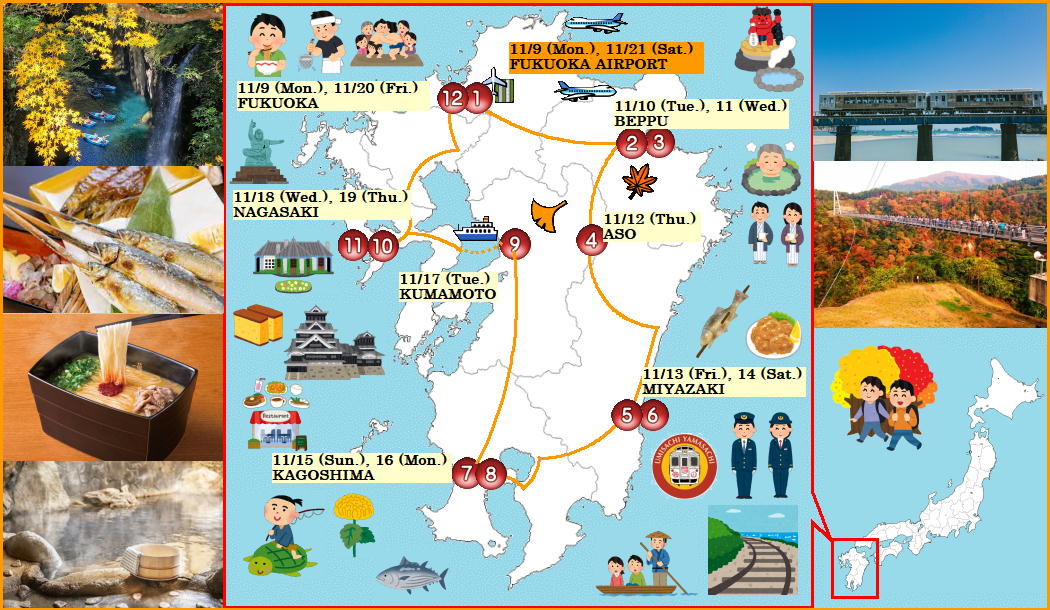 | Travel to Kyushu in autumn. Enjoy the nature, culture, onsen, and food of Kyushu. And there are many sightseeing trains in Kyushu. We will ride several popular sightseeing trains let's enjoy a train journey. On days where dinner is not included, there are many restaurants around the hotel, so please eat your favorite meal. For restaurants outside the hotel if you have $20/person it will be enough. You can eat at a local restaurant or buy a Bento, you have a lot of options. This tour is recommended for people who want to explore Kyushu in one trip. |